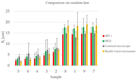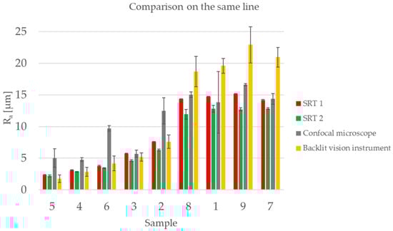 Overview of the results obtained by comparing the instruments on measurements performed on the same line on the surface. The samples are plotted in an increasing order of surface roughness of the reference instruments SRT 1. The error bar represents two times the range of the measurements.