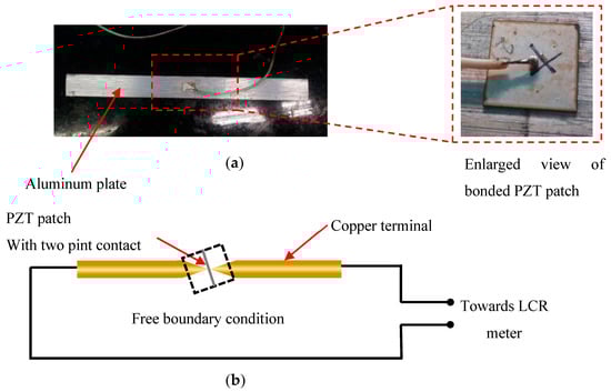 (a) Surface-bonded PZT patch on an aluminum plate, (b) free PZT patch setup for acquiring free piezo signatures.