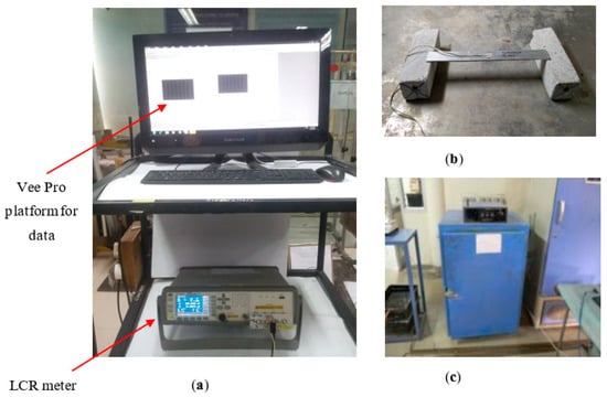 Experiment setup, (a) LCR meter and Vee-Pro platform, (b) setup for sensor bonded on the aluminum beam, and (c) oven used in the testing.