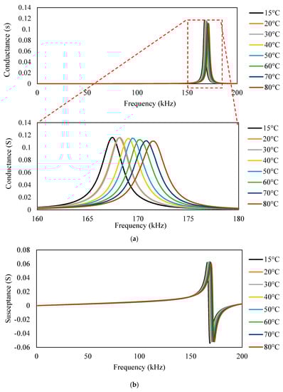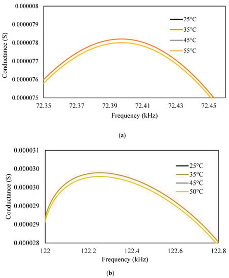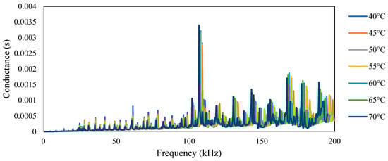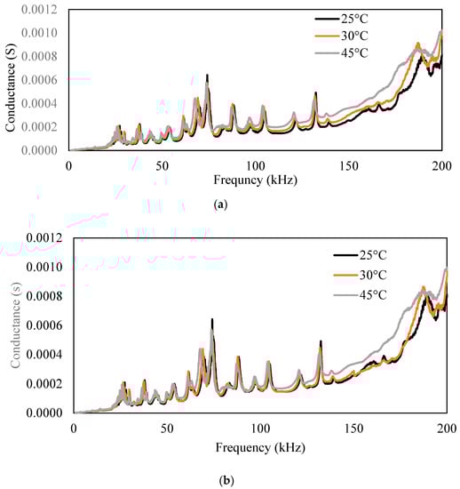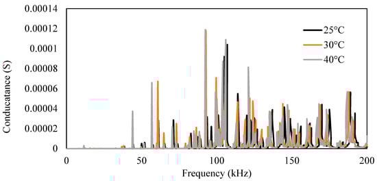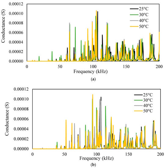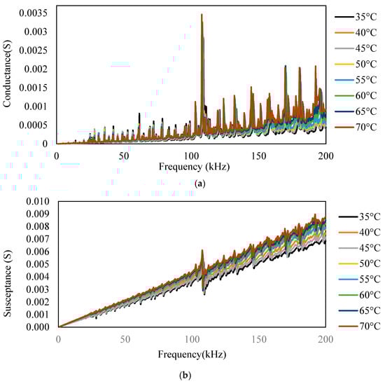 Figure 7 shows a plot of the conductance and susceptance signatures in the range of 1–200 kHz for the free piezo sensors. Unlike surface-bonded piezo, it was observed that in the case of free piezo sensors, both the conductance and susceptance signatures shifted toward the right with an increase in the temperature. The admittance signatures also shifted upward, although the upward shift was insignificant.