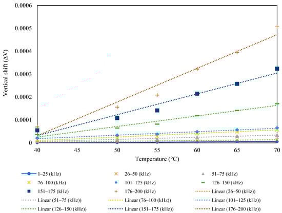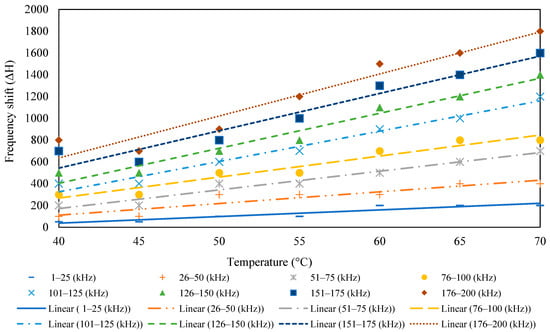 The surface-bonded piezo sensor was placed in the oven maintaining temperatures from 35 to 70 °C. The admittance signature for the frequency range of 1–200 kHz is plotted for all the temperatures, as shown in Figure 3. For the surface-bonded piezo sensor, both the conductance and susceptance signatures shifted toward the upward-left direction with the increase in temperature, indicating a decrease in peak frequency and an increase in the admittance signatures. Figure 4 shows the RMSD index for different temperatures. It is observed that with an increase in temperature, there is an increase in the RMSD value. The horizontal shift was computed using iterations for different frequencies, and the vertical shift was calculated by taking the average of the difference between two signatures. Figure 5 and Figure 6 show the nature of the shift horizontally and vertically as the function of temperature. For the lower range of frequency, there is less change in the slope of the graph, whereas for the higher range of frequency, there is a higher value of the slope. This indicates that higher frequencies are more vulnerable to temperature change. It is observed that both horizontal and vertical shifts of the admittance signatures are temperature dependent. The magnitude of the change in shift of admittance signatures increases with an increase in temperature. The shift shows a linear variation with the increase in the temperature for all the frequency changes. The slope of the curve increases in both shifts, which indicates shifts are also frequency dependent. Based on these observations, a compensation technique for the signature has been developed, which is discussed in the latter part of this paper.