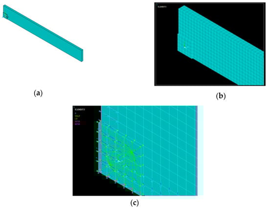 (a) 1/4th modeling of the aluminum block with PZT patch, (b) meshing of the model, (c) coupling effect.