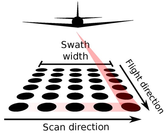 In an idealized case [48,49,50], an aircraft flies at a constant speed, direction, and altitude above ground level with zero roll, pitch, and yaw, and a known position. A line scanner aboard the aircraft scans the mapped area in the direction perpendicular to the line of flight. The scanner instantly captures a complete scan line with constant spacing between the points on the ground. The speed of the aircraft is constant to ensure that the point spacing in the scan line is the same as the spacing between the scan lines (Figure 1). Lastly, the aircraft flies in straight parallel lines separated by the width of the scan line (swath or flight strip), so that the individual swaths have minimal overlap, and cover the surveyed area without gaps. For a flat terrain without vegetation or other objects, the result would be a regular grid of points. However, none of these idealized procedures is fulfilled in real world conditions. Scanner type, flight plan execution, environmental conditions, data georeferencing, and the presence of vegetation and ground structures all influence airborne lidar data acquisition and the resulting variations in point density. The following paragraphs describe common density variations and related errors for airborne lidar point clouds.