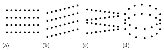 Decimation techniques range from simple ones, such as random sampling, to complex decimations based on shape of the objects described by the point cloud [82,89,90,91,92,93,94,95,96]. Random sampling can be based on the ordinal number of a point within the point cloud (count-based decimation). The resulting point cloud contains only every n-th point, but the overall point distribution remains the same; possibly preserving some of the variations such as higher density at the end of scan lines (Figure 16b). This technique works well for lidar point clouds when points are ordered by collection time and are used for creation of DTMs [97,98].