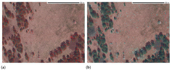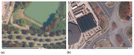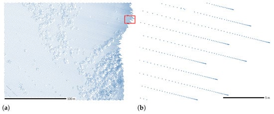 Horizontal point pattern in vegetated and nonvegetated areas: (a) Points from all returns had a regular pattern in open areas combined with irregular distributions in the vegetated areas. (b) Classified ground points in areas without vegetation had the original pattern, while in the areas with vegetation the distribution is much sparser. Dataset: NC Floodplain Mapping Program 2015 [42].