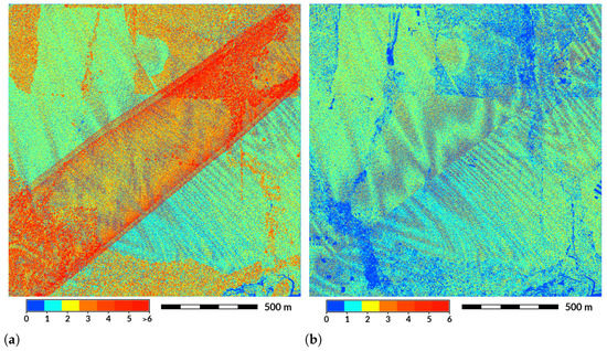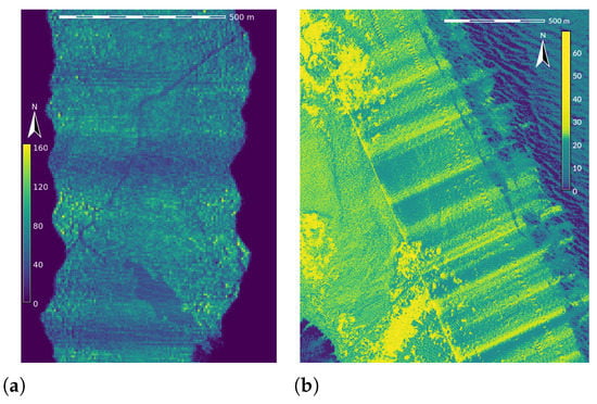Variable aircraft speed and pitch results in areas with higher and lower point density along the flight line (here approximately north-south direction). Point density is expressed as the number of points per grid cell at 6 m resolution (a) and 5 m resolution (b). Darker areas indicate lower point density while lighter areas indicate high density. Datasets: NCALM 2009 [44] (a) and NOAA 2008 [47] (b).