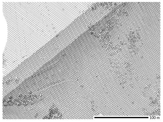 The spatial pattern of points is largely dependent on the type of scanner (Table 2, Figure 2). Rotating mirror scanners and oscillating mirror scanners produce parallel scan lines (assuming constant flight direction) or a zigzag line [51]. While parallel scan lines result in equal point density (Figure 2a,b), a zigzag line always results in variable point density (Figure 2c). Fiber scanners capture the whole scan line at once, producing parallel scan lines that are perpendicular to the flight direction, thus potentially leading to more uniform point distribution [49,52]. Scanners with conical (elliptical) scan patterns (Figure 2d), such as Palmer scanners and some single-photon scanners, measure with a constant scan angle in all directions [53,54,55]. Consequently, each location is scanned twice from different angles, and the conical pattern causes very high density on the edges of each swath unless the scanner accounts for that by changing the speed of scanning. The 1999 dataset by NOAA/NASA/USGS [45] had several overlapping swaths, but clearly shows a conical (elliptical) pattern and the resulting high point density on the swath edges (Figure 3).