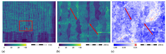 Places with low point density cause differences in skewness of point elevations. (a) Larger area showing two sets of north–south swaths. Color represents the number of points per square meter. (b) Dark violet areas represent places with low point density (<10 points per square meter). (c) Skewness of point elevations. Some areas with zero skewness (in white) are associated with areas with low point density. Most prominent places are marked by red arrows. Skewness is smoothed using circular 23 × 23 moving window to remove local extremes. Dataset: NCALM 2009 [44].