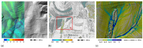 Error in swath elevation registration (a line close to the image diagonal): (a) Split view between point density and shaded relief (1 meter resolution, year 2013). (b) Elevation difference in meters; year 2015 minus year 2013. (c) Water discharge in simulated by SIMWE [65] with default parameters. Datasets: Wake County 2013 [43], NC Floodplain Mapping Program 2015 [42].