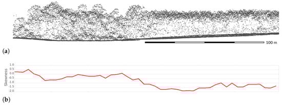 (a) Vertical distribution of lidar points in natural forest (left) and a planted forest (right) in a 220 m long and 30 m wide transect of a forested area. (b) Skewness of point elevations along the same transect without ground points. Dataset: NC Floodplain Mapping Program 2015 [42].
