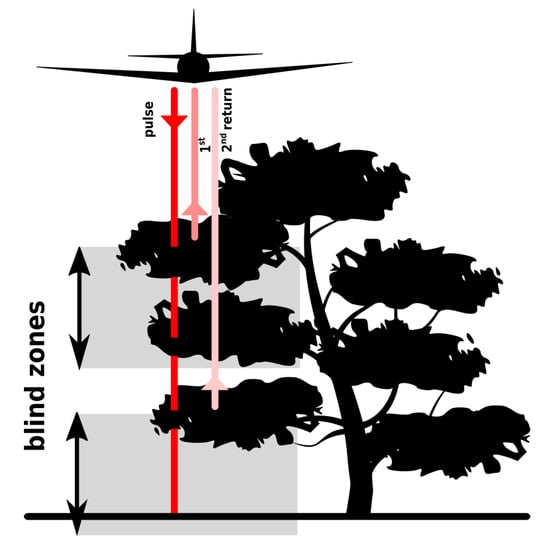The blind-zone effect, i.e., no points recorded after a given record, may cause the omission of points in certain parts of the vegetation or on the ground. Emitted pulse penetrates the canopy and produces returns. The first return is from top of the canopy and is registered by a detector. Then, no further returns from the canopy are registered until the detector is ready to record another return (top gray rectangle). When the detector is ready to register again, the second return is recorded from the lower parts of the canopy. Again, no further returns from the canopy or ground are registered because the detector is not ready to record (bottom gray rectangle).