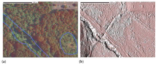 Lower density of ground points in vegetated areas or lack of points in wet areas usually causes these areas to be smoother than the rest of the area when points are interpolated into a DEM: (a) Lower density of all return points around a stream and in a vegetated, supposedly wet area (marked in blue). (b) Classified ground points (red) missing in some areas completely. The influence on the DEM becomes most apparent when the DEM is used to derive additional products such as the shaded relief here. Dataset: NC Floodplain Mapping Program 2015 [42].