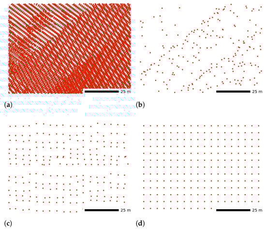 Given the prevalence of point density variations, algorithms working with point clouds should consider the effect of these variations [72,83]. However, not all applications can or need to remove the density variations from the point cloud. For example, such metrics as above-ground biomass (AGB) estimates [28], leaf area density (LAD) distribution [35], subcanopy solar radiation model [32], and the analysis of point density percentiles used as a measure of crown density [36] would be negatively affected by adding or removing points.