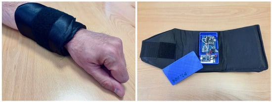 The design of the wearable must be lightweight and not hinder the athletes when performing physical exercise. For this reason, it has been built as a bracelet, as shown in Figure 1. The bracelet is made of a textile wrist support with Velcro straps for easy placement and an inner box that incorporates the electronic components of the device.