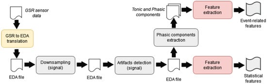 The process of feature extraction is applied individually to each data file resulting from the experiment previously described. At the beginning of the process, the GSR to EDA translation step converts the measurements acquired by the GSR sensor to electrodermal activity values (EDA). Both measures serve to reflect emotional arousal, but GSR measures the skin electrical resistance in ohms and EDA the conductivity in siemens. This conversion has a twofold purpose. On the one hand, it allows the calculation of features based on the analysis of the EDA signal peaks. These features have been widely used in the problem of emotion recognition. On the other hand, given the existence of commercial wearables integrating an EDA sensor (for example, the Empatica E4 wristband [53]), an emotion recognition system based on those values could be highly reusable and able to work with physiological data from different devices.