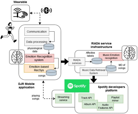 As part of the DJ-Running project, we developed a service-based system for improving the motivation and performance of long-distance runners through Spotify music [46]. The system selected and played music according to the runner’s emotions, the characteristics of the training session, and the environment in which she/he was training. From a technological point of view, the solution consisted mainly of three software systems. Firstly, a music emotion recognition system was used, called RIADA [47], which determined the emotions that the listeners feel when listen to a song. This system processed the catalogue of Spotify songs and created a set of labels that describe the emotional effects each song provokes to the listeners. Secondly, an emotion-based music recommender was used, which interpreted the runners’ context to determine the songs to be played during the training session [46,48]. These recommendations considered affective criteria based on the emotions produced by the songs (and described by the RIADA labels) and the emotions felt by the runners. Finally, a mobile application was used that interacted with the recommender to play the recommended songs. The innovation of the DJ-Running system resides in the possibility of adapting the music to the emotions that the runner is feeling at each instant, her/his emotional changes and the geographic characteristics of the environment in which she/he is running. This disruptive factor requires recognising and interpreting the runner’s emotions in real-time, for example, using wearable technology. In [49], we sketched the earlier ideas regarding the design of a wearable that could provide the required support for this type of emotion recognition.