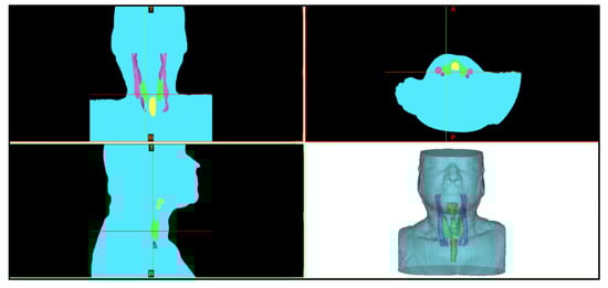 On the inside of the complete 3D model, a set of segmented structures are presented where it is possible to observe the following structures: thyroid (pink), trachea (yellow), and veins and arteries (blue) (as seen in Figure 20). Also, a video overview illustrating these results can be found in the Supplementary Information (Video S1). These inner colors were chosen to highlight and emphasize the anatomical region under analysis. These views are obtained through the View3D module, to control the cuts through the SoClipPlane module in the MeVisLab® software.