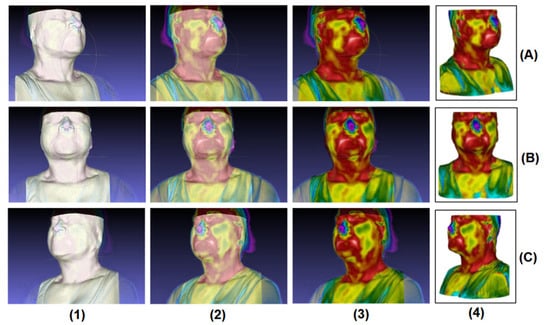 Right after the alignment, it follows the thermal imaging projection (as represented in Figure 11), which is visualized within its inherent texture/thermal differences, generating what is called the 3D thermal shell/geometry. Detailing what arises from Figure 11, there is a demonstration of the texturing process on the previously segmented bust, in different imaging positions/views (frontal and lateral sides). Therefore, the steps of the texturing and projection process are: (1) the representation of the bust (3D model) without thermal texturing; (2) the projection of the infrared images onto the 3D model (showing transparency); (3) the visualization of the projection with all the infrared images directly on the model; (4) finally, the generation of the 3D thermal shell.