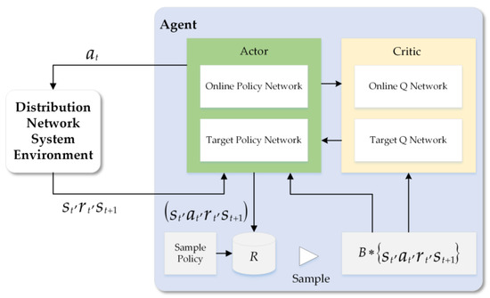 The deep deterministic policy gradient (DDPG) [32] algorithm is introduced to solve the complex coordinate EV charging and voltage control problem with high-dimensional and continuous action spaces by only using low-dimensional observations. The DDPG algorithm is a policy-based DRL algorithm with actor–critic architecture. Both actor and critic contain two neural networks, with actor consisting of two DNN with parameters and , and critic consisting of two multilayer perceptron (MLP) with parameters and , respectively. The construction of the DDPG algorithm is shown in Figure 2. Similar to standard reinforcement learning, DDPG has a learning agent that interacts with a distribution network environment in discrete timesteps. The input of the DDPG agent is the system state at time step and the output is action . We assume the studied DN environment is fully observed. To ensure independence between samples when using neural networks, DDPG uses experience replay technology to ensure independence between the samples used for target value updating. After each interaction of the agent with the environment, we can obtain a sample containing , , , and , and store this sample in the replay buffer. The agent continues to interact with the environment until the set condition is met, then samples are randomly sampled from the replay buffer to minimize the loss (Equation (25)) of the critic network and to calculate the gradient (Equation (27)) of the actor network to softly update the parameters of the critic and actor networks, respectively.