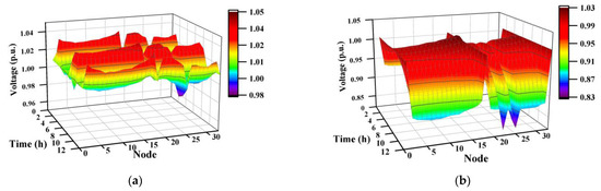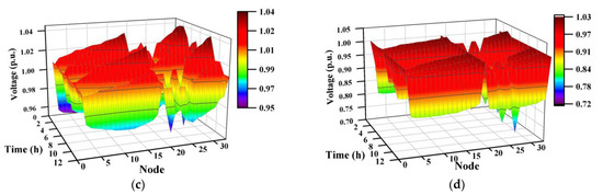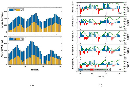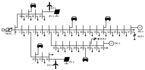 In recent years, electric vehicle (EV) technology has developed rapidly, driven by breakthroughs in battery technology [1,2]. As a substitute for fossil fuel vehicles, EVs have received extensive attention due to their environmentally friendly characteristics [2,3,4,5]. EVs can reduce traffic pollution emissions and have lower charging costs than refueling, which has been widely accepted and deployed [6,7,8,9]. However, large-scale numbers of EVs connected to the power grid will bring challenges, such as frequency excursion and voltage fluctuation [10]. The voltage stability of the distribution network (DN) is an issue that needs to be focused on. The uncontrolled charging process of EVs will affect the voltage stability of the distribution network [11]. When EVs are connected to the power grid in vehicle-to-grid (V2G) mode, this situation will further deteriorate. In addition, the access of distributed generators (DGs) to the power system changes the direction of power flow, and the injection of active power upstream by distributed generators (DGs) causes voltage rise and interferes with Volt/Var control (VVC) equipment [12]. The intermittency, randomness, and fluctuation of renewable energy sources (RESs) can cause voltage fluctuations in the distribution network [13].