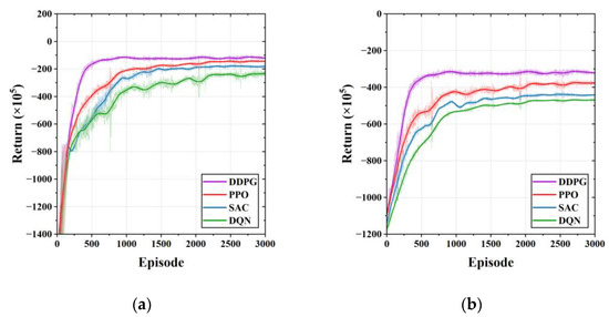 The DDPG algorithm combines the success of the actor-critic approach and DQN [33] using dual networks on top of the deterministic policy gradient (DPG) algorithm. The DPG algorithm is based on the actor–critic structure, which consists of an actor and a critic. The critic is learned using the Bellman equation as in Q-learning. According to Equation (26), the update rule for the parameters of the critic is given by Equation (27).