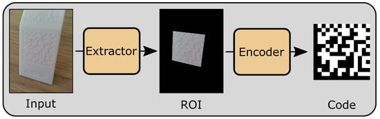 In order to read DPM on SLS parts, a novel approach that is more flexible to lighting conditions and low-contrast surfaces is needed. Therefore, a small and lightweight deep learning approach to encode DPM on SLS parts into matrices representing data matrix codes is presented. The process of the approach is depicted in Figure 4, where an input image is converted to a matrix representation after running through several encoding steps.