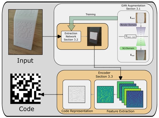 The presented approach is based on deep learning models for extracting and reading data matrix codes on SLS-printed parts. The method can be used to scan parts manually with a mobile phone or by placing cameras on top of processing lines. Therefore, the method considers pictures of parts placed close to the camera and aims to achieve low memory consumption. As depicted in Figure 2, an input image is passed to an extractor (Section 3.2) computing a segmentation for region of interests (ROIs) with an accurate masking. Afterwards, the extracted region is passed to an encoder (Section 3.3) in order to produce standard data matrix code. Furthermore, to enhance the extractor’s training process, a generative adversarial network (GAN) is used to generate and augment training data to overcome data limitations in production pipelines (Section 3.1) [].