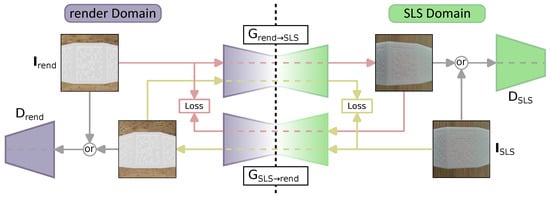 As depicted in Figure 3, the rendered image’s () characteristics are transferred to the real-world SLS domain in order to enhance the image’s appearance close to real-world pictures (). Therefore, rendered images are passed into the generator acting as a function to transform rendered into real-world images. Utilizing the discriminator, the images are scored as real or fake. The loss is calculated by combining generator, discriminator and cycle loss. In Section 4, it is shown that the images not only look similar to human eyes but also improve the deep learning model’s training process.
