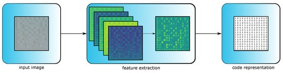 An input image is processed by the encoder model. First, convolutional layers followed by normalization are used to extract multiple features. Here the features are presented as abstract feature maps. The feature maps are aggregated by a last convolutional layer and afterwards, a matrix representation for the code is computed by a fully connected layer combined with a sigmoid function.