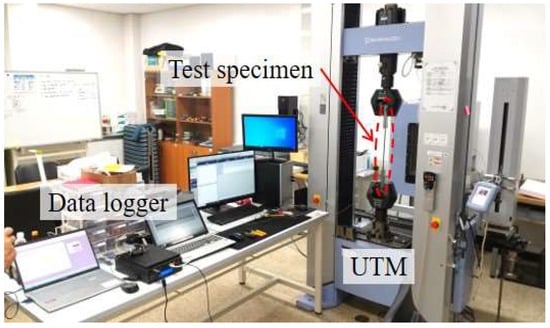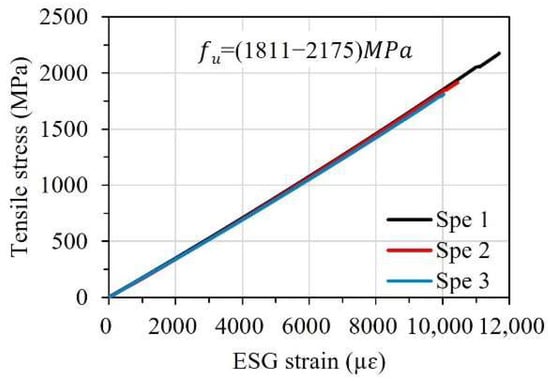 In this study, carbon fiber-reinforced polymer strips (SK-CPS-0512) supplied by the SK Group (Seoul, Republic of Korea) were utilized to manufacture FBG-FRP specimens. Three tensile specimens of FRP strips with the same cross-section dimensions as the FRP strips used for the FBG-FRP composite specimens (a thickness of 1.2 mm and a width of 15 mm) were fabricated and tested in tension in accordance with ASTM D3039 []. Figure 1 illustrates the tensile test setup of the FRP strip. The stress–strain relationship and mechanical properties are presented in Figure 2 and Table 1, respectively.