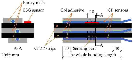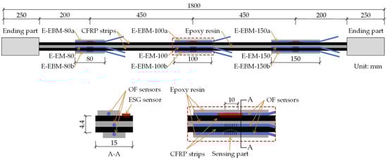 After embedding three OF sensors between two FRP strips, six OF sensors were externally bonded to the front and back surfaces of the FRP strips (see Figure 8d). The externally bonded OF sensors were fabricated by following the same procedure as the embedded OF sensors. Then, to evaluate strain transfer from the FRP strip to the OF sensors, ESG sensors were attached at the middle position of the bond length (see Figure 8e). To ensure the complete transfer of tensile stresses, the ending parts of the test specimens were bonded into rectangular steel tubes using epoxy, as shown in Figure 8f. The length of the FRP strip embedded inside the rectangular steel tube was calculated in order to prevent debonding, which can happen before fracture failure of the FRP strip. Finally, the FBG-FRP specimens were cured for 7 days under temperature conditions of 23 ± 3 °C in accordance with ASTM 3039 [] before performing the experiment. Regarding the EC specimen, after using adhesive tape to maintain the small pressure, CN adhesive was used to bond the OF sensors to the FRP strip with a bond length of 10 mm at each ending part. The remaining part of the entire bond length was bonded using epoxy resin (see Figure 6).