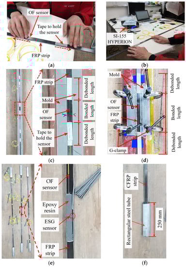 Figure 8 shows the fabricating process of the FBG-FRP specimens in the laboratory. The surfaces of each FRP strip were roughened using emery paper to increase the adhesion between substrate and adhesive. Next, they were cleaned with acetone solution before attaching the OF sensors. The OF sensors were fixed using adhesive tape after applying a small amount of pressure, as shown in Figure 8a. This small pressure corresponding to 5% of the strain capacity of the OF sensor was applied in order to keep the OF sensor straight during the fabrication process. The magnitude of the applied prestress can be controlled through the shift wavelength variation of the OF sensor, which was observed on the HYPERION SI-155 optical sensing instrument (see Figure 8b). Then, the FRP strip attached with the OF sensors was placed in a mold and filled with epoxy resin to join it with the other FRP strip (see Figure 8c). Regarding the embedded OF sensors, the adhesive tapes were kept when filling with epoxy resin to achieve the desired bond length. The specimen was demolded after curing for 24 h in order to attach other OF sensors to the surface of the FRP strips.