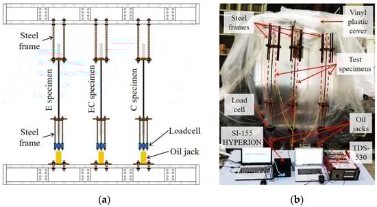 The setup schema of the short-term tensile test is shown in Figure 9a. One ending part of the test specimen was fixed by the steel frame, while the other was subjected to sustained tensile loads using oil jacks (TECPOS TDC-2015) with a capacity of 200 kN. The applied load was controlled using a load cell (CAS LS-20B) with a capacity of 200 kN. Meanwhile, the SI-155 HYPERION optical sensing instrument and the TDS-530 data logger were used to record the data from the FBG and ESG sensors, respectively (see Figure 9b).