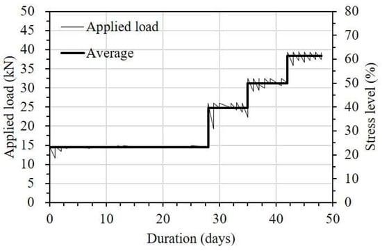 According to ACI 440 [], the total applied stress for design purposes is limited to approximately 55% of the ultimate tensile strength in CFRP in order to prevent creep rupture failure. At present, a limited number of experimental results have been reported regarding the minimum bond lengths needed to maintain the strain transfer ability from FRP strips to OF sensors corresponding to differently sustained stresses. Therefore, test specimens were subjected to four different stress levels of 20, 40, 50, and 60%, corresponding to the ultimate tensile strength (fu) of the FRP strip. In the progression of stress, a stress level of 0.2fu was maintained for the first 4 weeks, and then the next increments were maintained for 1 week each. Figure 10 illustrates the loading history applied to the test specimens during the short-term creep test. The applied load was checked and controlled every day to maintain the target load before recording the data. The vinyl plastic cover was used to create a small and enclosed space around the testing area to control temperature and humidity (see Figure 9b). During the test, the temperature and humidity conditions were maintained within the ranges of 23 ± 3 °C and 50 ± 10%, respectively, in accordance with ASTM 3039 [].