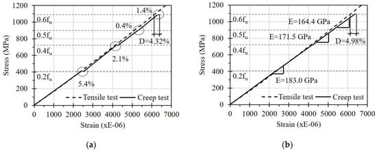 Figure 11 shows the stress–strain curves of the FRP strips under the short-term creep test. The dotted lines in the figures are for comparison, and the stress–strain curves of the FRP strips obtained from a simple tensile test are shown in Figure 2. The solid line shows the relationship between stress and strain of the FRP strip subjected to loads with a duration of 28 days for 0.2fu and 7 days for each subsequent increments. The stresses were calculated by dividing the applied load on the FRP strip by the cross-sectional area of the FRP strip. It should be noted that the displayed strains are the average values of the three strain gauges attached to each FRP strip.