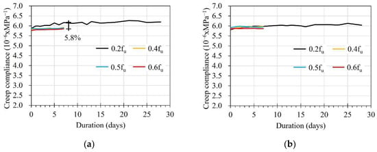 where and are the creep compliances and strain at time (t), respectively, and is the applied stress. The applied stresses were calculated by dividing the applied load by the cross-sectional area of the FRP strip. Figure 12a presents the average creep compliances of the FRP strip in the E specimen under different stress levels. The average creep compliance showed a gradual increase over time at 0.2fu. After increasing the stress to 0.4fu, 0.5fu, and 0.6fu, it was found that changes in the average creep compliances over time were not significant. It can be seen that a maximum difference of 5.8% was observed between the average creep compliances at 0.2fu after applying the load for 7 days compared to the others. This can be explained by the significantly higher creep strain in the early stage of duration. Meanwhile, no differences between average creep compliances under different stress levels were observed in the C specimen, as shown in Figure 12b. This can be attributed to the strain on the FRP strip due to the creep effect not being displayed clearly in the C specimen (see Figure 11b).