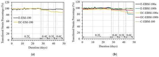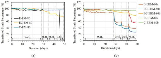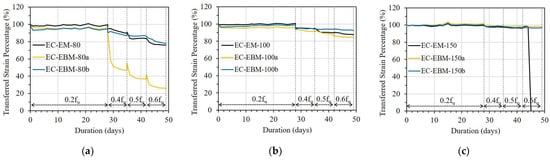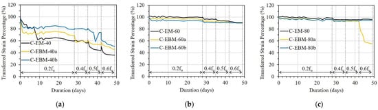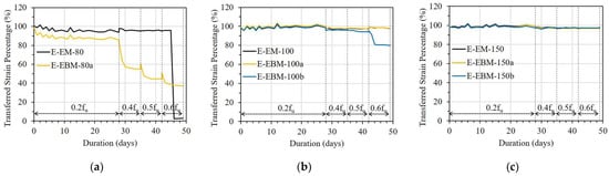 Figure 13, Figure 14 and Figure 15 show the variation in TSPs from the FRP strip to the OF sensors under different stress levels. It can be seen that the bonding methods, namely the embedded method (EM) and the externally bonded method (EBM), affected the strain transfer from the FRP strip to the OF sensors. E-EM-80 showed an overall constant TSP after a small decrement until debonding occurred, whereas E-EBM-80a showed a gradual decreasing pattern over time (see Figure 13a). In detail, the instantaneous TSP values of E-EBM-80a and E-EM-80 were 99% and 100% after applying 0.2fu and then slightly decreased to 86% and 94%, respectively. However, the TSP of E-EBM-80a decreased more rapidly at a stress level of 0.4fu, and this decreasing pattern continued corresponding to increasing time. Conversely, E-EM-80 maintained a stable TSP of approximately 94% after the stress level was increased to 0.4fu. Even after the stress level was increased to 0.6fu, E-EM-80 did not show any decrement in TSP, but the TSP momentarily became “0” on the fourth day. From Figure 13b,c, it can be seen that when the bond length of the OF sensor by the embedded method was 100 mm or more, the strain could be transferred to the OF sensor very effectively for a loading period of 50 days in total. On the contrary, in the case of the external bonding method, it can be seen that the transmission rate of the strain started to decrease at a stress level of 0.4fu at a bond length of 100 mm, and in the case of 150 mm, it was transmitted very effectively throughout the entire period.