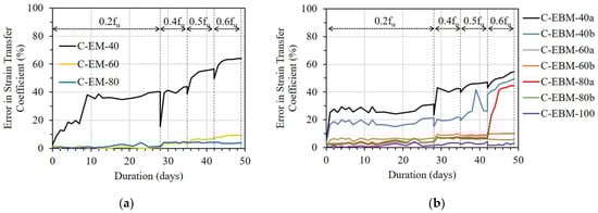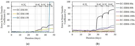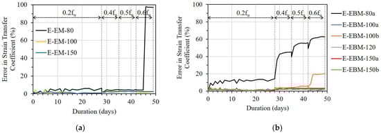 Figure 16 presents the error ratio in the ESTC of the E specimen corresponding to bond length. In the case of the EM, E-EM-80 showed a critically sharp increment in ESTC under a stress level of 0.6fu; meanwhile, E-EM-100 and E-EM-150 did not show any noticeable changes (Figure 16a). Regarding the case of EBM, the ESTCs of E-EBM-80a and E-EBM-100b were significantly increased from the stress levels of 0.4fu and 0.6fu, respectively (Figure 16b). This implies that minimum bond lengths of 100 and 120 mm are recommended for the EM and EBM, respectively, in order to sufficiently transfer the strain from the FRP strip to the OF sensor.