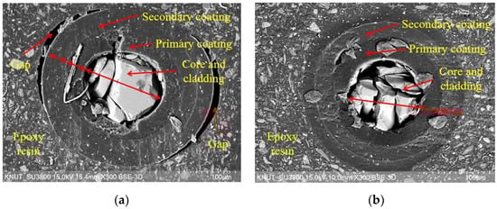 Figure 21a,b show the SEM images of the OF sensors in the E specimen with bond lengths of 80 and 150 representing the cases with and without debonding, respectively. It can be seen that the core and cladding parts were broken after the preparation procedure of the samples due to their brittle characteristics. Meanwhile, the primary and secondary coatings were well preserved. Figure 21a shows the SEM image of E-EBM-80a, which showed a severe reduction in TSP due to debonding. It can be seen that clear gaps appeared due to debonding. Meanwhile, no gaps were observed between the component layers of the OF sensor, such as the primary and secondary coatings or the primary coating and core. This is consistent with the assumption that the bond strength between these layers is higher due to the long bond length compared to the bond strength between the OF sensor and the epoxy layer. In contrast, no gaps were observed in the SEM image of E-EBM-150a due to an unremarkable reduction in TSP (see Figure 21b).