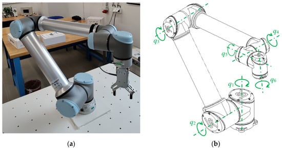 In Figure 1a is a sample of the robotic arm of UR10 and, in Figure 1b, the axes of the joints are marked (qx).
