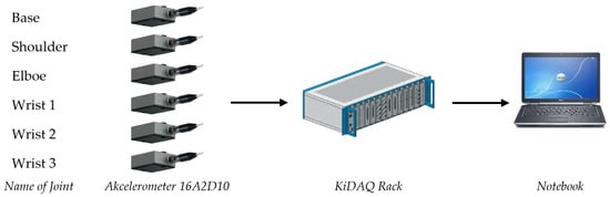 In order to validate the measurement methodology, we used existing measurement equipment at our disposal. These are a three-axis accelerometer with TEDS, 10mV.m−1.s−1, type 4524-B, serial number 33154, and a six-channel PUlSE 3560-B-120 measuring unit from Brüel&Kjær. Using these devices, we measured the acceleration at the end of the sixth joint—Wrist 3—according to the first measurement position from the proposed vibration measurement methodology. The aim of the acceleration measurements is to verify whether the proposed measurement methodology can actually be used.