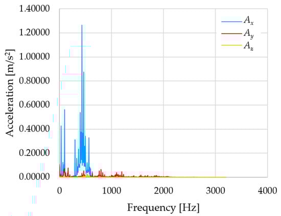 Based on the data shown in Table 3, Table 4 and Table 5, the acceleration progress depends on the frequency in the individual accelerometer axes for the individual movement velocities of the first joint—the Base of the robotic arm. The first three dominant frequencies are listed for each measurement direction.