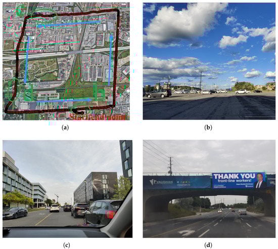 The data for the analysis are collected in and around York University, Toronto, Canada. York University and adjoining areas cover all the aspects of multiple multipath profiles needed for the experiment. The profiles include highways, parking lots, sub-urban with vegetation, overpasses, and open sky environments, each having a unique multipath characteristic and contributing to better appreciating the range error behaviors. Figure 2 shows the aerial and detailed street view photos of these measurement campaigns, and blue arrows indicate the direction.