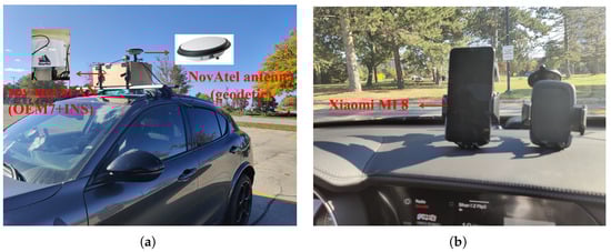 As shown in Figure 3, the experimental setup contains two sensor suites. The first contains two geodetic GNSS receivers to provide position trajectory references for tested smartphone. One NovAtel OEM7 receiver is mounted on a rooftop as a reference station within a 5 km baseline, whilst the other receiver is connected with a geodetic antenna and mounted inside the vehicle experimental box (see Figure 3a). The second sensor suite includes Xiaomi MI 8 phone, which is fixed with holders and mounted on the vehicle dashboard to mimic real-life applications (see Figure 3b). In addition, it is feasible to mount MI 8 on the top of the experimental box for in-depth comparison and further analysis. The lever arm between the smartphone and the referenced center has been carefully measured.