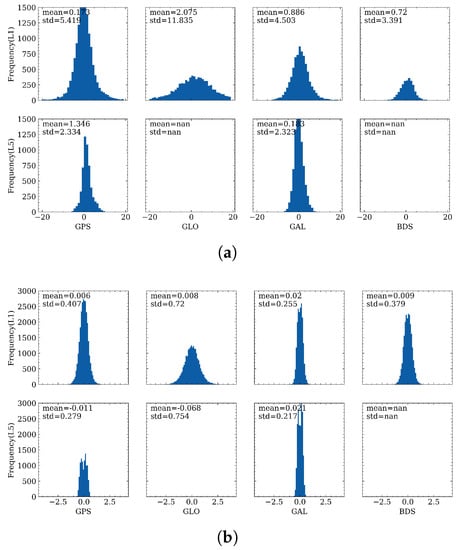 The distribution of range errors on the first and third frequencies is first analyzed. As shown in Figure 4, the upper subplots show the distribution of range errors for the smartphone, while the lower panel gives the results for MGEX stations. It can be observed that, for both smartphone and geodetic receivers, the standard derivation (STD) for the third frequency is smaller than the first frequency, with values of 7.3 m on P1 and 2.1 m on P5 for smartphones, and 0.5 m and 0.2 m for those of geodetic receivers, respectively, which indicates that the observation precision on the third frequency is higher. This difference may be due to the fact that the bandwidth of L5 is larger and the transmitted power of L5 is higher than the first frequency. Therefore, the anti-interference ability and anti-noise performance may also be significantly improved for L5 [31,46,47]. The range errors for the geodetic receivers are obeying a nearly zero-mean distribution, while for smartphones, the mean values are not zero, but rather 0.8 m and 0.6 m for the first and third frequencies, respectively. When further investigating the range errors, the STD of range errors for the geodetic receiver on P1 is 0.5 m, considering that the double-differenced measurements are formed when calculating the range errors, the original code precision should be 2 times smaller than the range errors by applying the error propagating law, which is 0.2–0.3 m. This value is consistent with the code precision used in MGEX data processing as in [48], which demonstrates the validity of the proposed range error derivation method.