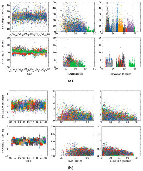 Two common weighting schemes are applied to smartphone and geodetic receiver observations, namely SNR-based and elevation angle-based weighting, respectively. These two weighting schemes indicate that measurement quality is highly related to the SNR and elevation angles. Therefore, in this subsection, the relationship between range errors, elevation angle, as well as SNR values, is assessed. Figure 6 depicts the temporal characteristics of range errors and the corresponding relationship with SNR and elevation angles, and different colors represent different satellites. It can be noted again that the range errors on the first frequency are larger than those on the third frequency from the left panel which shows the time series of the range errors. In addition, there is a significant decreasing trend when the SNR increases for smartphone data both for P1 and P5, and a similar situation can be observed when comparing the relationship between range errors and elevation angles for geodetic receivers. Due to the short observation time for the smartphone data (only 30 min), elevation angles are not fully distributed from 0–90 degrees. However, it can also be concluded that, when the satellite tracked by a smartphone is newly rising or falling, the range errors will increase slightly, and therefore the elevation cut-off angle should be set reasonably. For the test ZIM3 observation, no correlation between range errors and SNRs can be found; this may be the reason that the geodetic receiver is under an optimal observation environment, and the SNR values are at a high level, which less affects the range errors.