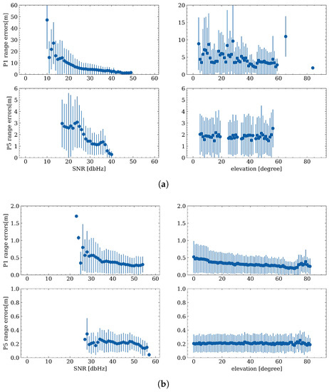 To further investigate range error correlations, error bars are plotted in Figure 7 to show the mean values and STDs of absolute range errors at different SNR values and elevation angles. The dots and lines denote the mean values and STDs of absolute range errors, respectively. As shown in Figure 7, it can be clearly observed that there is a significant correlation between smartphone range errors and SNR values, especially on the first frequency. Concurrently, a small correlation on the P1 range errors for geodetic receivers can be observed, which is similar to the results in [44]. The small STD for geodetic receivers at low SNR values (around 25) is due mainly to the limited observations with low SNRs. On the other hand, there is a decreasing STD trend on P1 for the geodetic receiver when the elevation angles are increasing, while the mean values and STDs seem to be stable for P5, which have not been mentioned in the previous research.