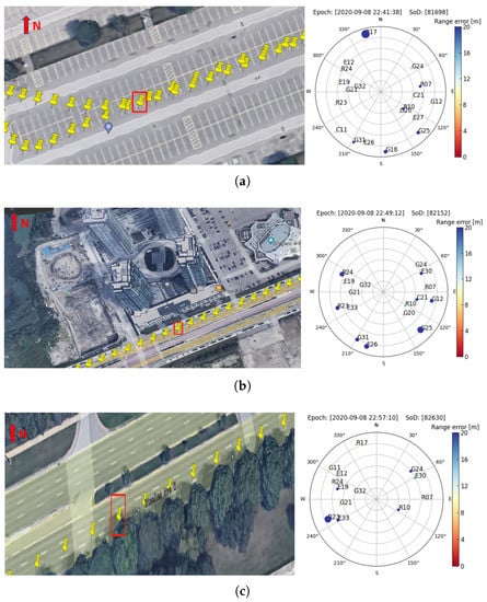 As shown in Figure 8, three typical epochs are selected for detailed analysis: (a) in a parking lot, and can be regarded as an open sky area; (b) in a suburban area, where the car was driving close to tall buildings; (c) in a vegetated area, where the car was close to trees on one side of the road. The sky plots on the right show the corresponding epoch, the second of the day (SoD), and range errors for different satellites are presented by different colors and sized dots (the larger the dots, the larger the range errors). It can be seen from Figure 8 that, owing to nearby buildings and trees limiting sky visibility, GNSS signals were blocked significantly, reducing satellite visibility. As expected, the range errors are at a low level when driving in the parking lot, except for satellite R17, whose elevation angle is under 5°. In contrast, range errors increase significantly when the vehicle was in the suburban area, even for signal azimuths without building blockage. While driving in the vegetation area, it seems that the signal blockage by the tree has limited impacts on the range errors of other tracked satellites.