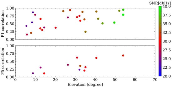 In smartphone GNSS data processing, quality control is vital and more challenging compared to geodetic data. Pre-fit outlier rejection is one effective quality control method. Therefore, in this subsection, the correlation between ranger errors and pre-fit residuals is assessed. As shown in Figure 9, different colors represent different satellites. It can be concluded that the range errors and pre-fit residuals for P1 have a higher correlation than P5, while the range errors and pre-fit residuals for P5 are at a lower level compared with P1. The reason for a higher correlation in P1 could be that the smartphone antenna is designed for the first frequency, and may not be optimized for other frequencies. To further evaluate the correlation satellite-by-satellite, Figure 10 illustrates the relationship among correlation coefficient, elevation angle, and SNR, where each dot represents one satellite and different colors denote the corresponding SNR values. With a lower elevation angle, the correlation coefficients tend to be smaller. Usually, GLONASS satellites have the highest correlation coefficients despite larger range errors. One possible reason is that, for other constellations, due to the high noise level itself for smartphones, the correlation between range errors and pre-fit residuals can be easily hidden within the noise; while there is a larger range error for GLONASS satellites, so the correlation can be more conspicuous. The results indicate that pre-fit residual rejection/de-weighting is worth further investigation and may provide potential solution improvement in future research, as it reflects the range errors with a high confidence level.