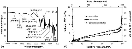 (a) FTIR spectra and (b) N2 adsorption-desorption isotherms with the corresponding pore size distribution of the as-synthesized nanomaterial.